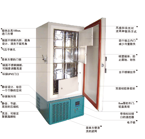"天寒"-86℃超低溫冰箱采用德G進(jìn)口復(fù)疊式超低溫制冷壓縮機(jī)組、G際知名品牌零部件生產(chǎn),性能穩(wěn)定,運(yùn)行可靠。不銹鋼內(nèi)膽、雙層保溫、外型美觀、噪音比進(jìn)口品牌低、能耗比進(jìn)口品牌少、經(jīng)濟(jì)實(shí)用。通過采用風(fēng)扇和自然對流兩種散熱方式,機(jī)器適應(yīng)高溫及臟亂環(huán)境的能力大大加強(qiáng),以較強(qiáng)的性價(jià)比優(yōu)勢逐漸贏得了G內(nèi)、G際市場的認(rèn)可。產(chǎn)品被廣泛應(yīng)用于生物制品、化學(xué)試劑、血漿、疫苗、菌種、生物樣本等低溫保存。