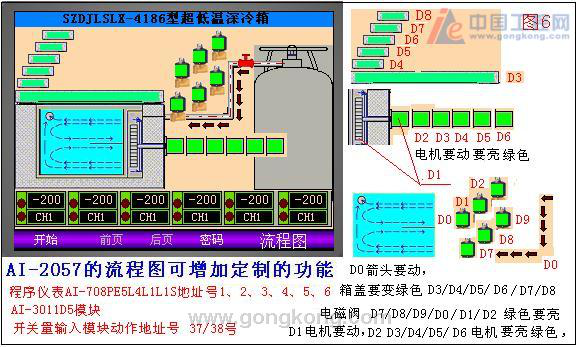 在人機(jī)界面實(shí)時(shí)監(jiān)控多臺(tái)SZDJLSLX-4186型超低溫深冷箱,在觸摸屏流程圖上實(shí)時(shí)監(jiān)控運(yùn)行狀態(tài),群控低溫深冷箱,用開關(guān)量輸入模塊AI-3011D5M模塊來實(shí)現(xiàn)低溫深冷箱運(yùn)行狀態(tài)的反應(yīng)。